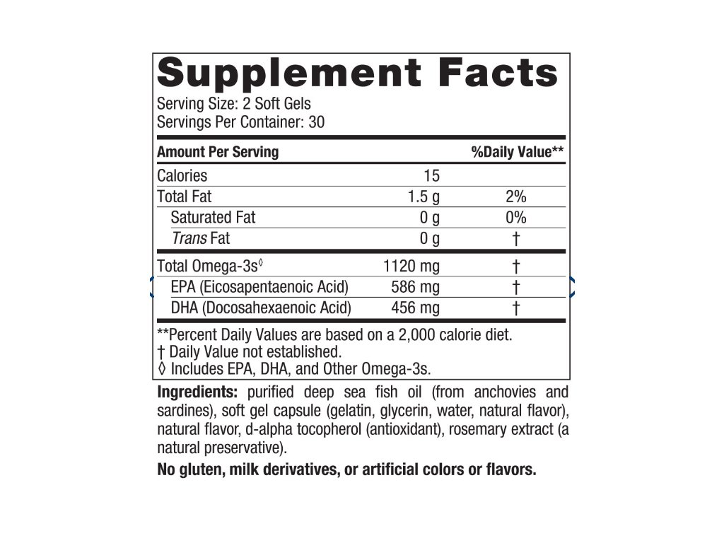 Čištěný olej z hlubinných ryb (z ančoviček a sardinek), měkká gelová kapsle (želatina, glycerin, voda, přírodní aroma), přírodní aroma, d-alfa tokoferol (antioxidant), extrakt z rozmarýnu (přírodní konzervant).