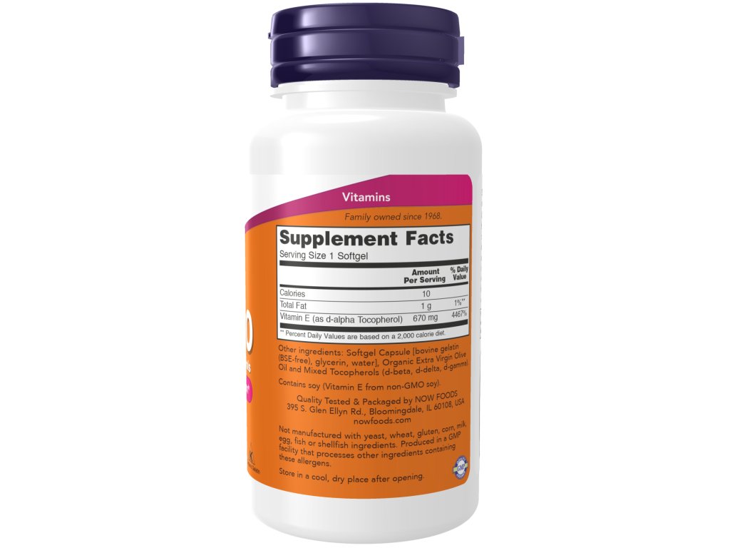 NOW Foods - Vitamín E-1000 (se směsí tokoferolů) je 100% přírodní vitamín E se 670 mg v jedné dávce. Plní funkci hlavního antioxidantu a je důležitý při ochraně buněk těla před narušením volnými radikály.