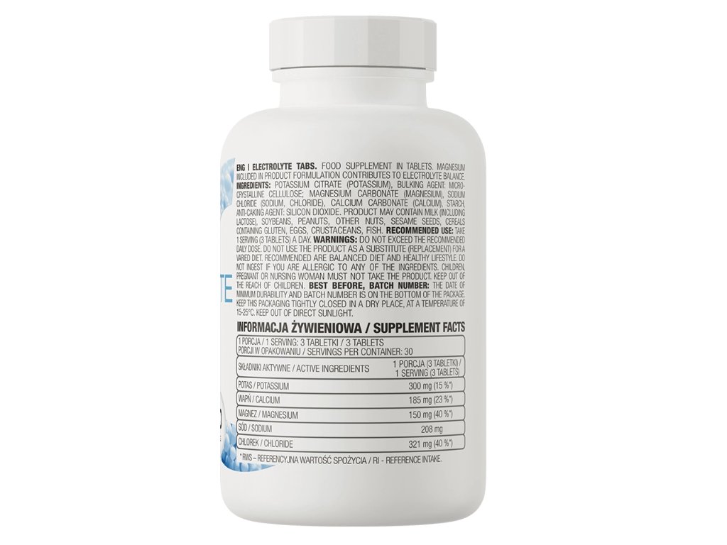 Doplněk stravy ve formě tablet, což je sada až pěti různých elektrolytů. Produkt byl vytvořen pro lidi ohrožené ztrátou těchto cenných účinných látek, kteří nemají rádi suplementaci ve formě šumivých tablet nebo ve vodě rozpustného prášku. Intenzivně cvičíte, hubnete, máte problémy s pitím správného množství tekutin nebo vás trápí nepříjemné zažívací potíže? Hladinu elektrolytů můžete doplnit používáním doplňku stravy OstroVit Electrolytes.