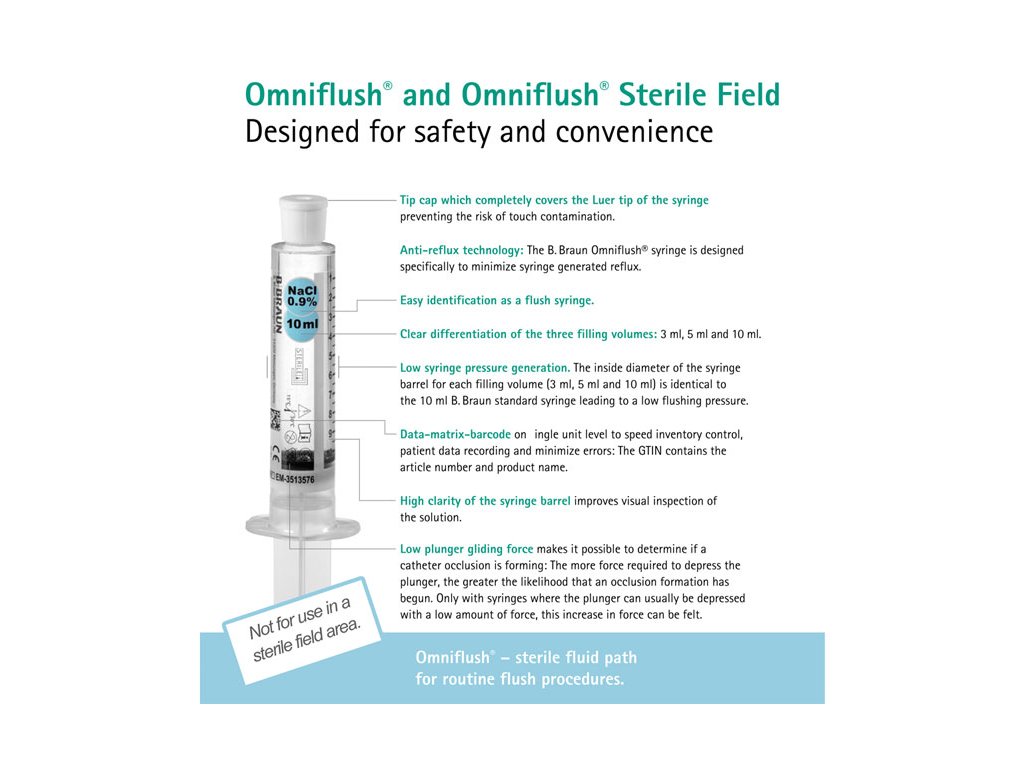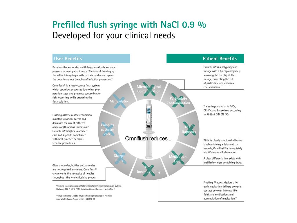 Injekční stříkačka Omniflush® je navržena speciálně pro minimalizaci nežádoucího zpětného toku krve do lumen katétru, čímž snižuje riziko zablokování katétru. S Omniflush® lze množství tekutiny použité pro proplachování snížit na požadované minimum. Pro proplachování všech složitých přístupů.