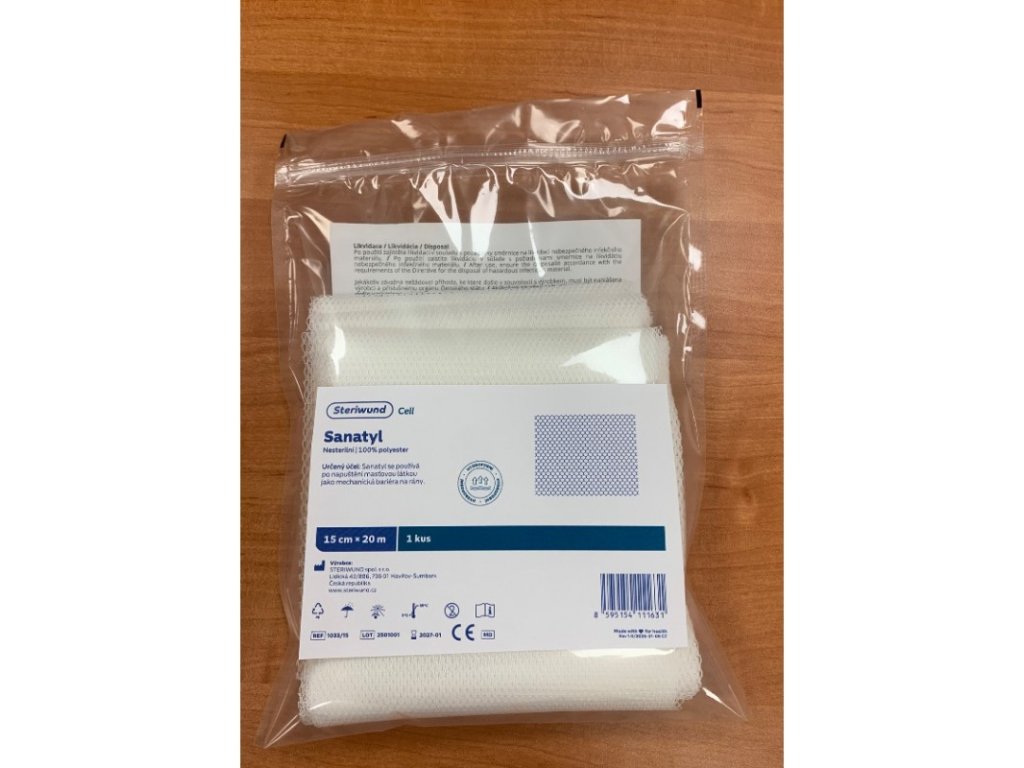 Sanatyl, nesterilní je vysoce porézní, hydrofobní osnovní pletenina ze 100% PES vláken. Je poddajný a zásluhou vhodné vazby kopíruje reliéf pokrývané oblasti. Syntetická vlákna neprorůstají do nově rostoucí tkáně. Díky napuštění v mastné látce (např. vazelína) však může nabývat komplexnějšího mechanismu účinku jako mechanická bariéra rány proti okolí.