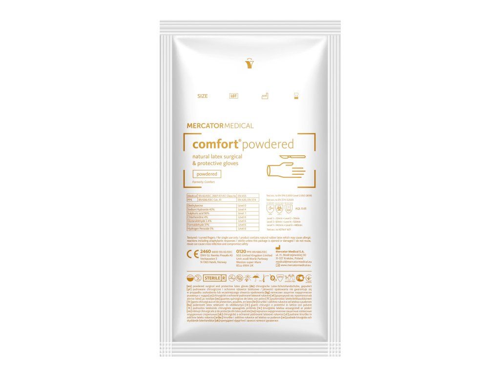 COMFORT jsou pudrované, latexové operační rukavice. Jsou sterilní a mají anatomický tvar.